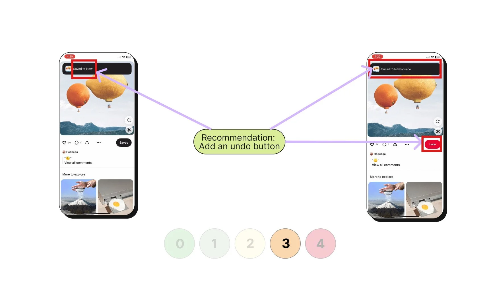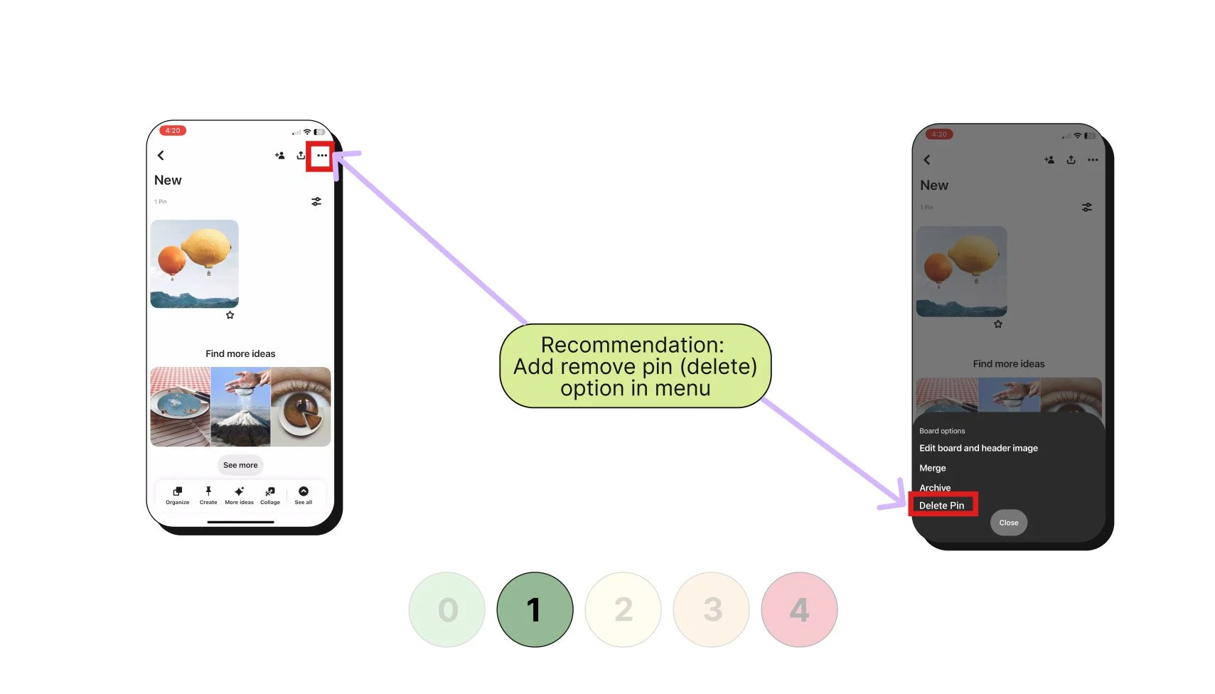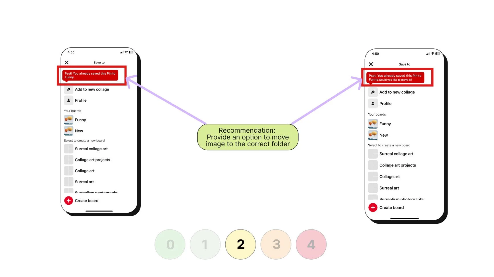 To improve error recovery, I proposed adding a contextual prompt that appears when a pin is saved. For example, if the system detects the pin may not belong in the selected folder or if the user realizes the mistake immediately, a notification could offer options such as “Move to another board” or “Undo.” This proactive design helps users quickly recover from errors, reduces frustration, and creates a smoother, more forgiving experience.