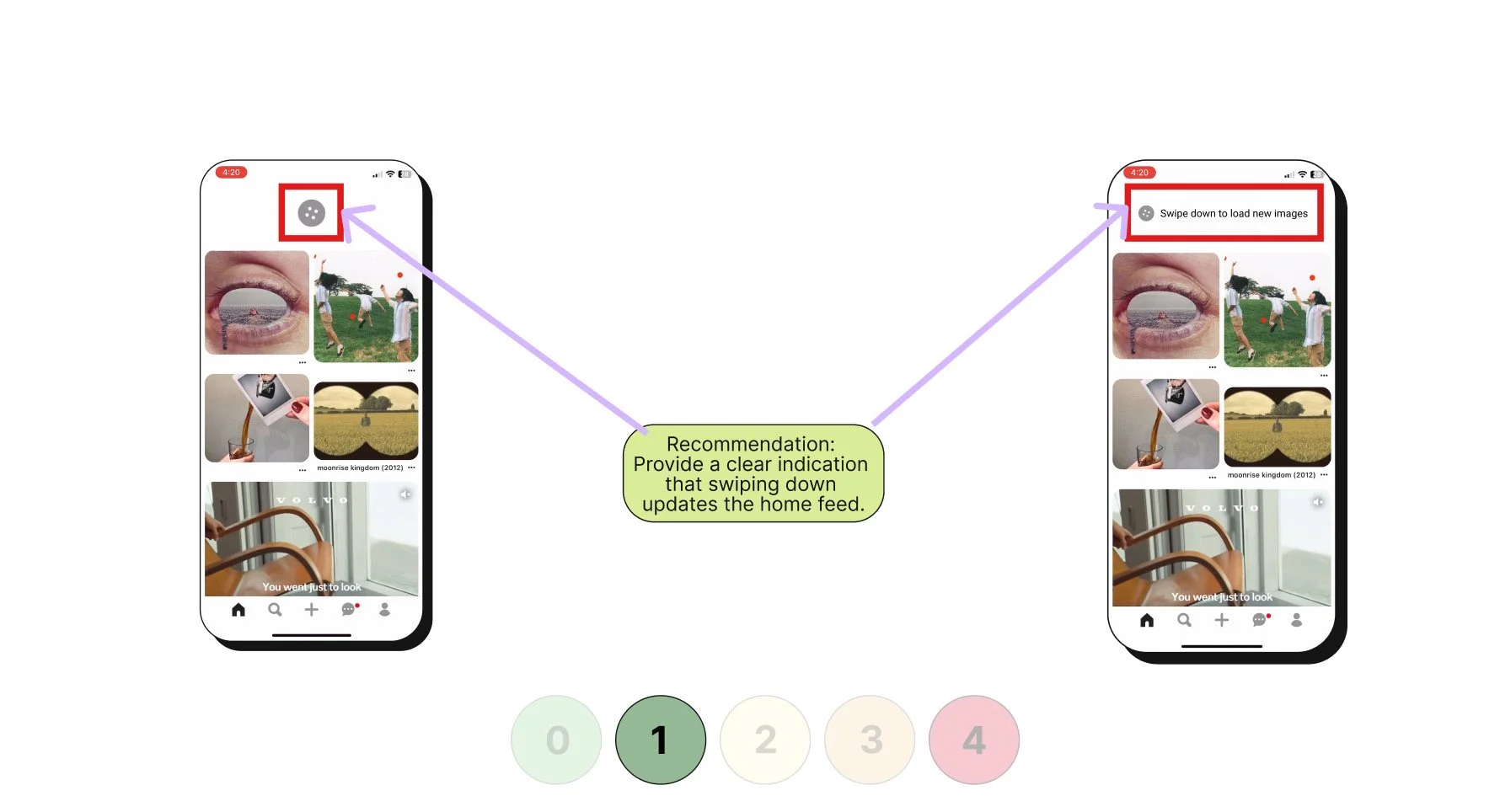 During the evaluation, I noticed that the loading icon at the top refreshed the home feed with a new set of images. However, this action was not communicated clearly to users, leaving them unaware of what was happening when the refresh occurred.