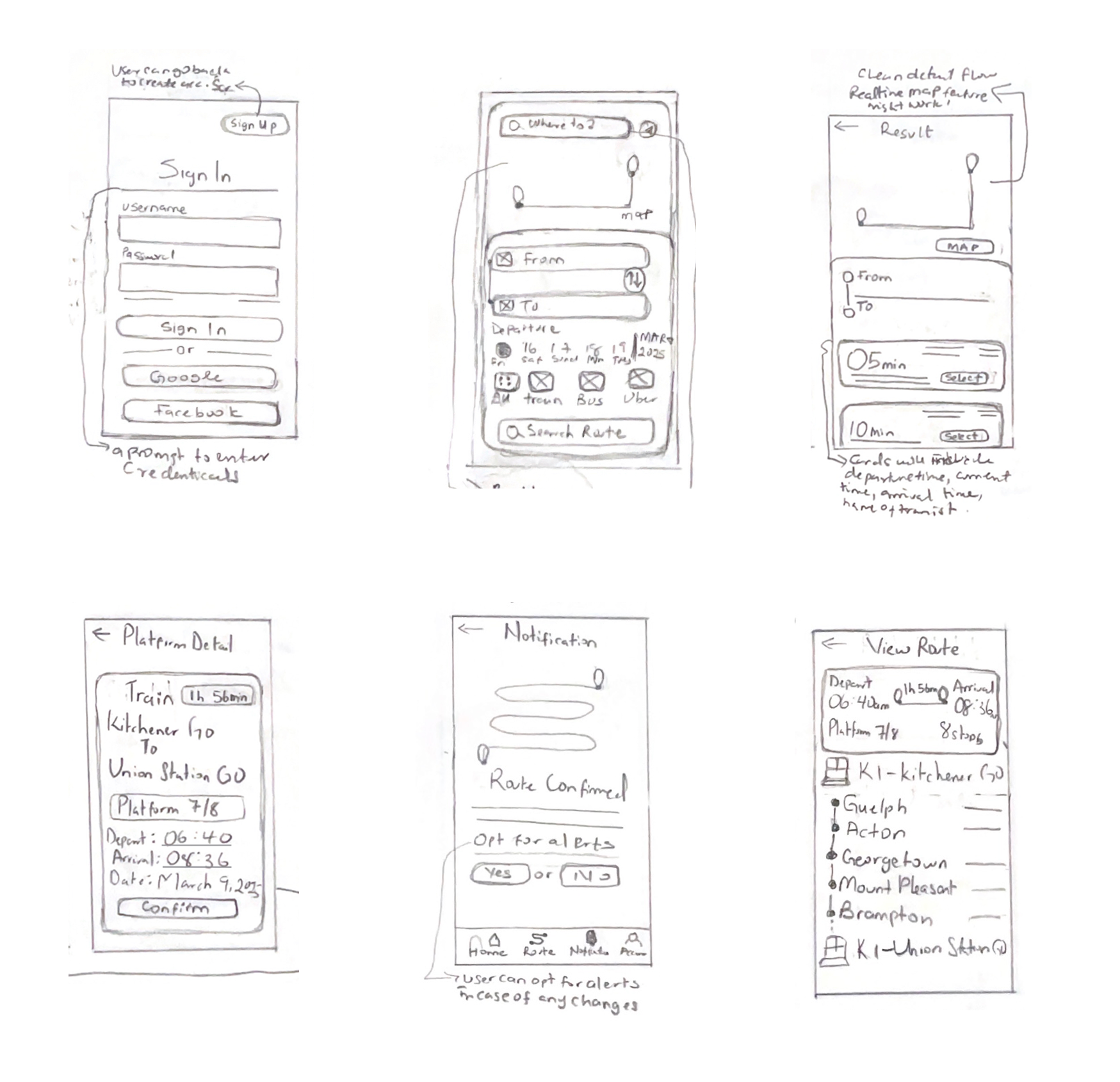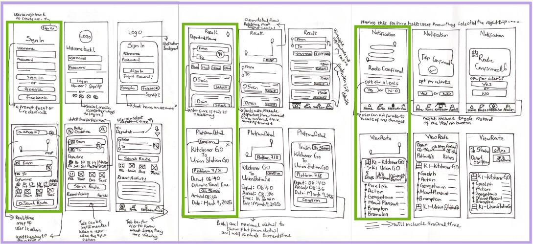 With the solution sketches, I focused on one priority: make platform information impossible to miss; by prioritizing real-time visibility, clear route results, and proactive notifications.